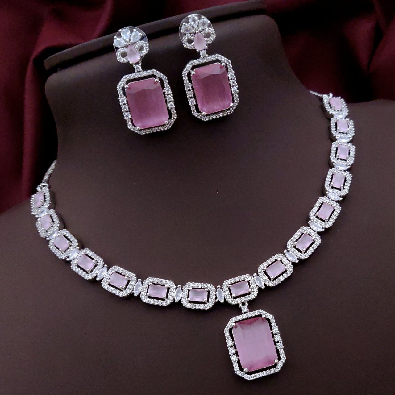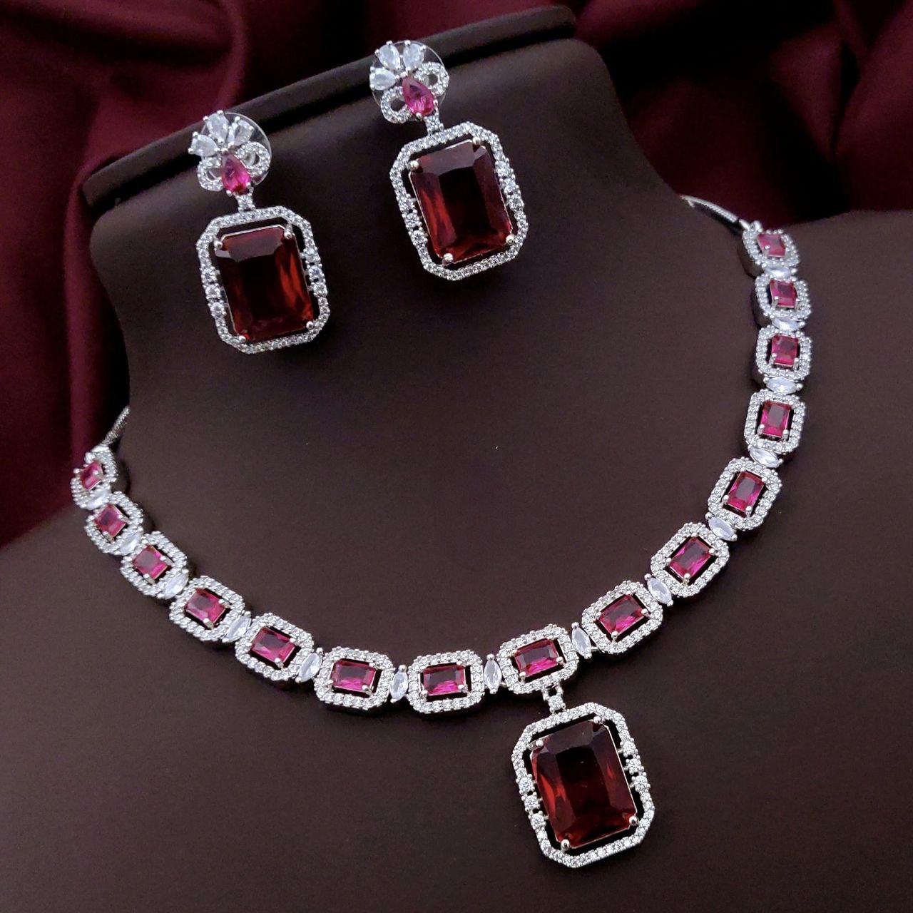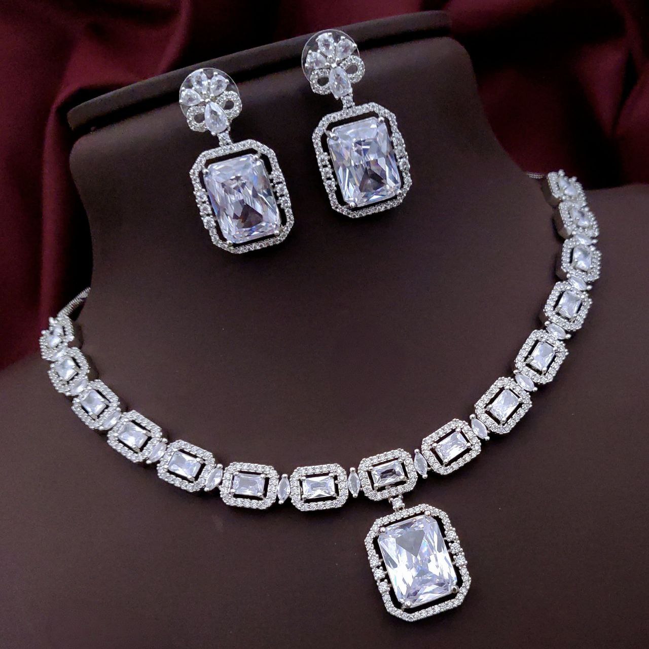 Premium AD necklace set with rectangular center stones and CZ detailing. Includes matching earrings. Available in 8 stunning colors.