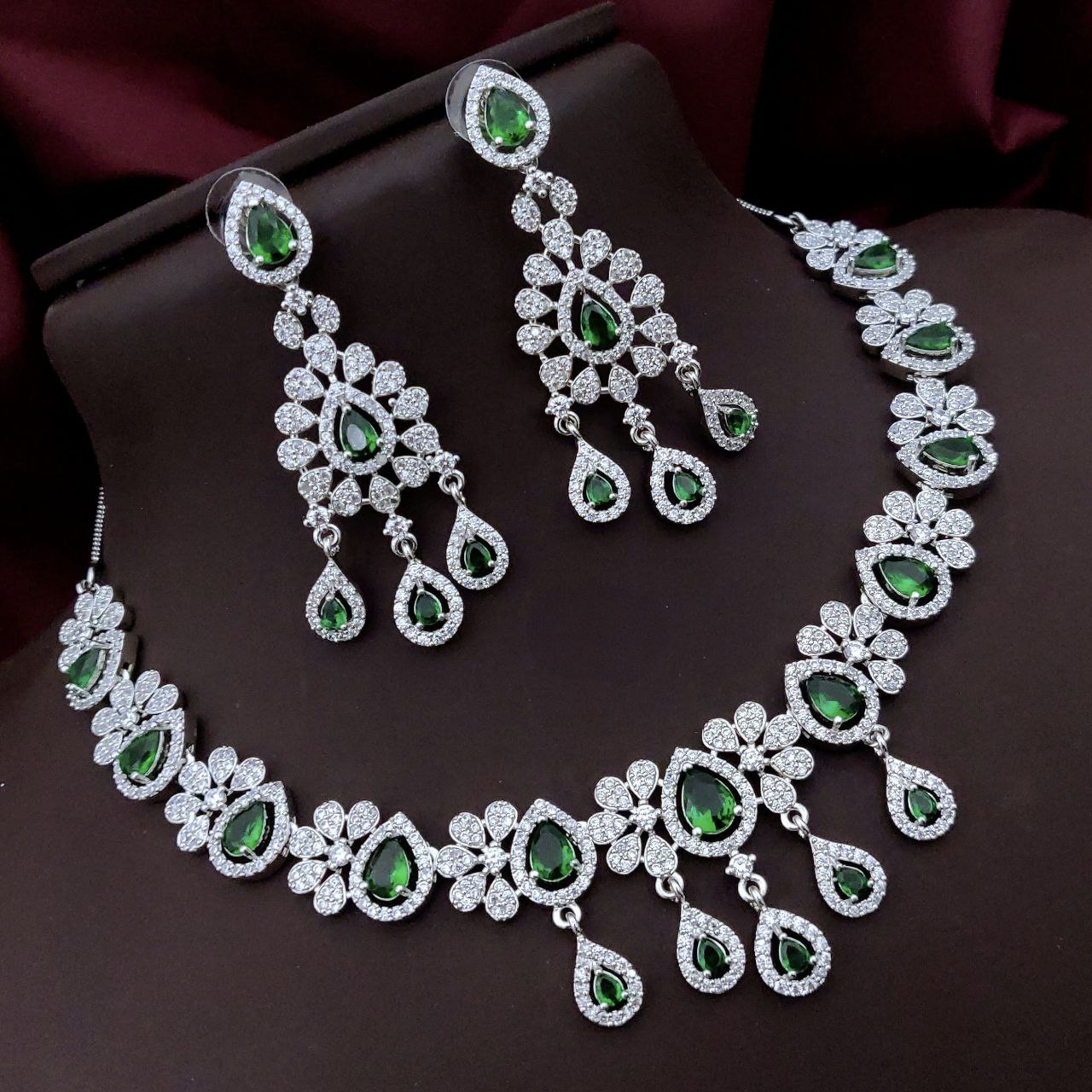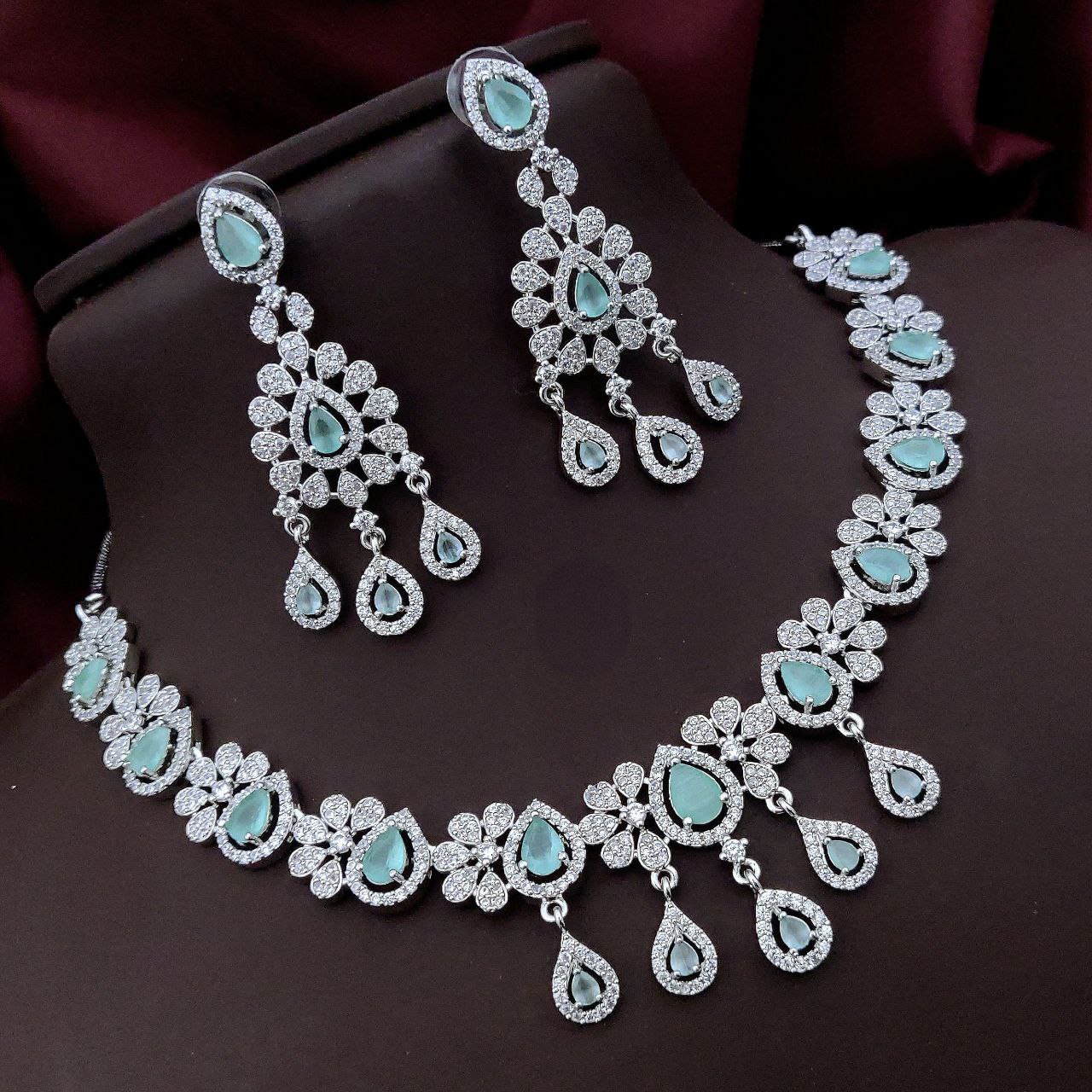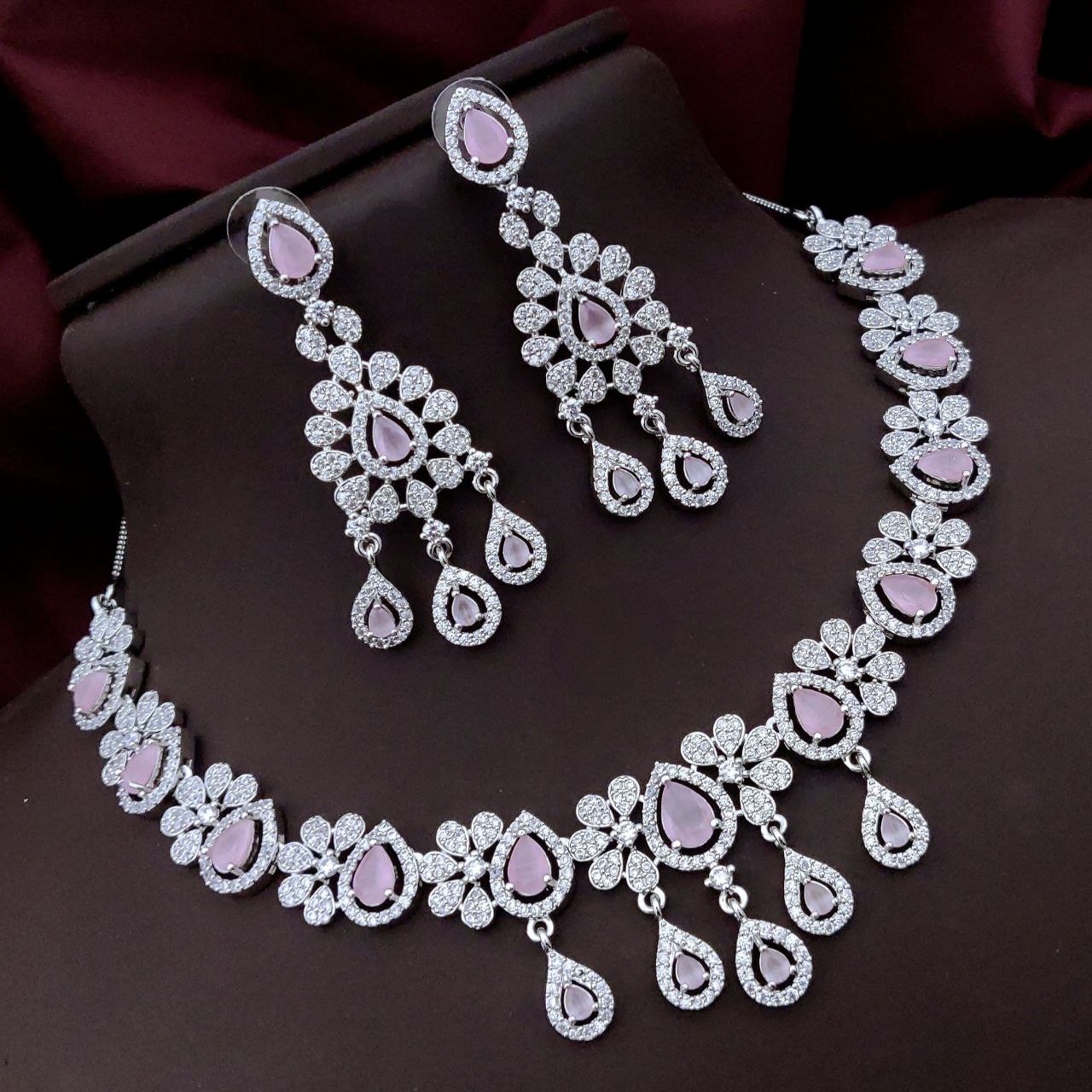 Adorn yourself with this stunning floral-themed American Diamond necklace set, designed with intricate teardrop-shaped stones and delicate dangling drops. The premium craftsmanship and detailed petal pattern make it a perfect accessory for weddings, receptions, or festive occasions.