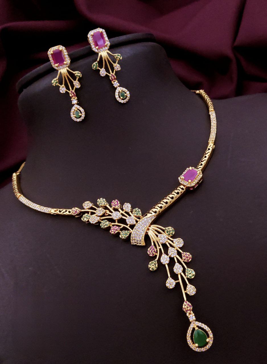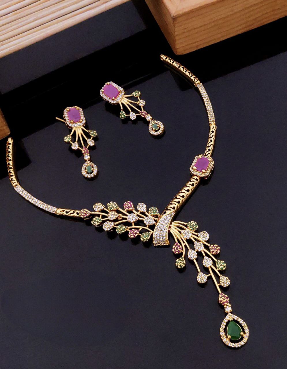 This elegant Floral Vine Necklace Set is a stunning blend of modern charm and traditional detail. Designed in a flowing vine pattern, it showcases ruby-toned square centers on both the necklace and earrings, with emerald green teardrop dangles adding rich contrast. Multicolored floral motifs (green, pink, and white) are paved in high-quality cubic zirconia (CZ) stones, offering a radiant sparkle from every angle.