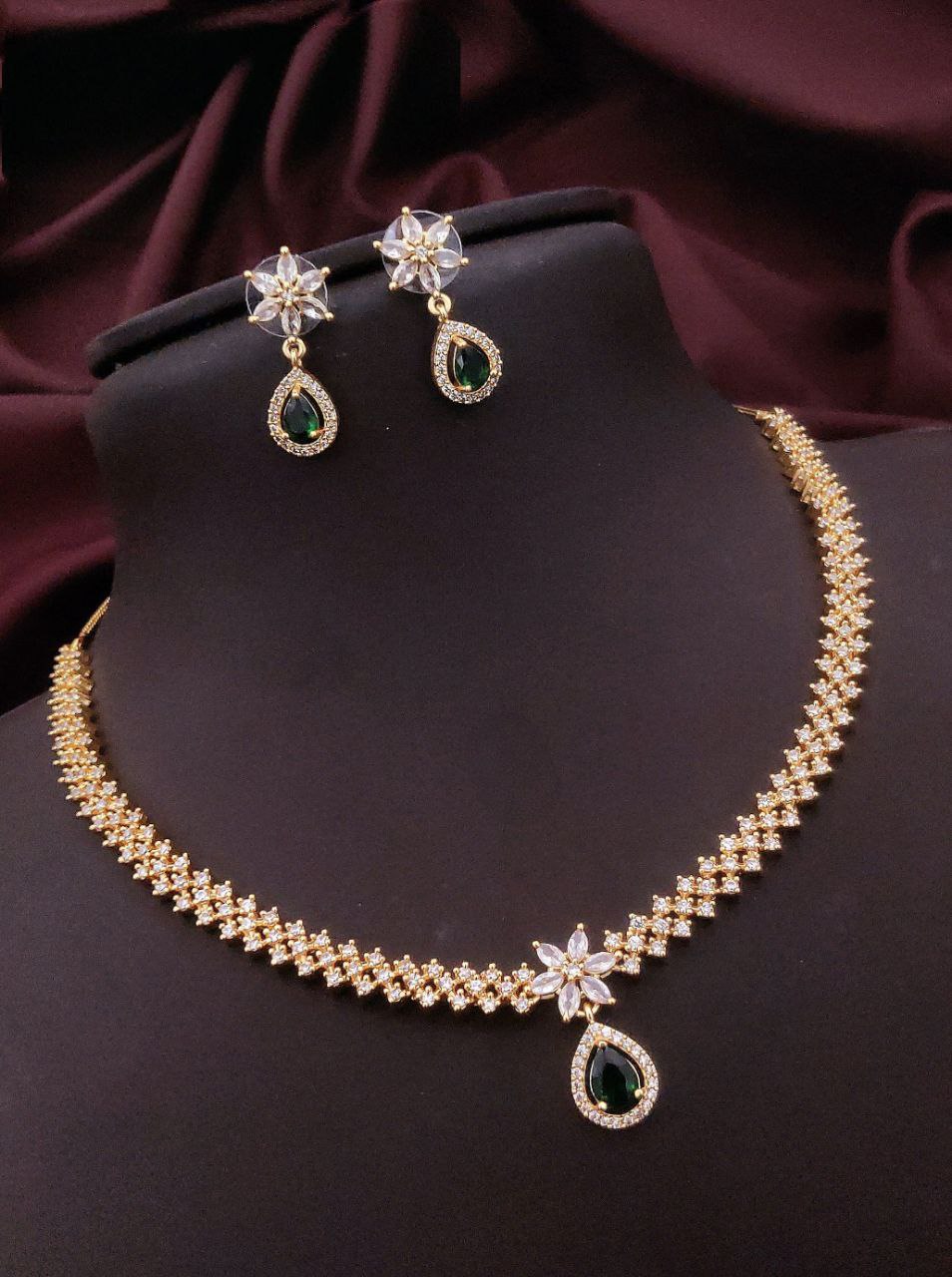 A sophisticated floral‑motif necklace set plated in gleaming gold, featuring teardrop-colored gemstones and clear CZ accents. Includes matching earrings. Available in Green, Pink, Royal Blue, Red, and Clear (White) teardrops.