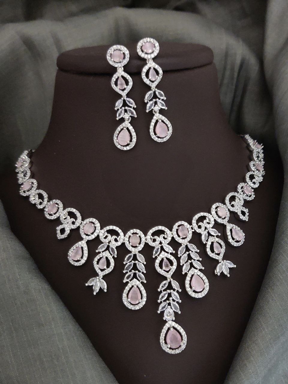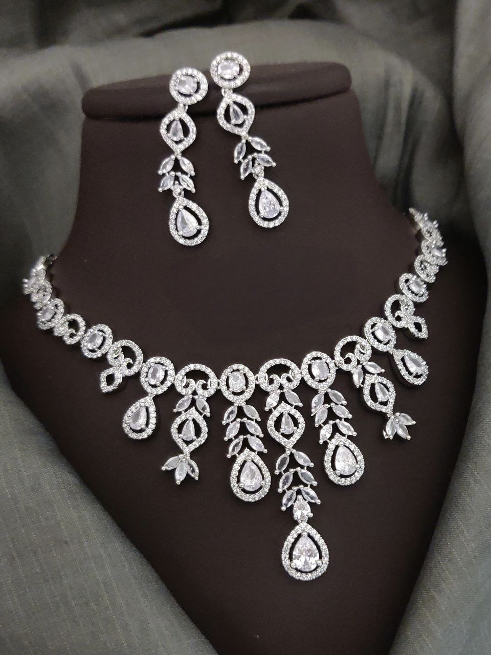 A captivating necklace and earrings set featuring teardrop-shaped stones, elegant leaf motifs, and intricate CZ-studded design. Perfect for weddings, festive occasions, and elegant evening wear.