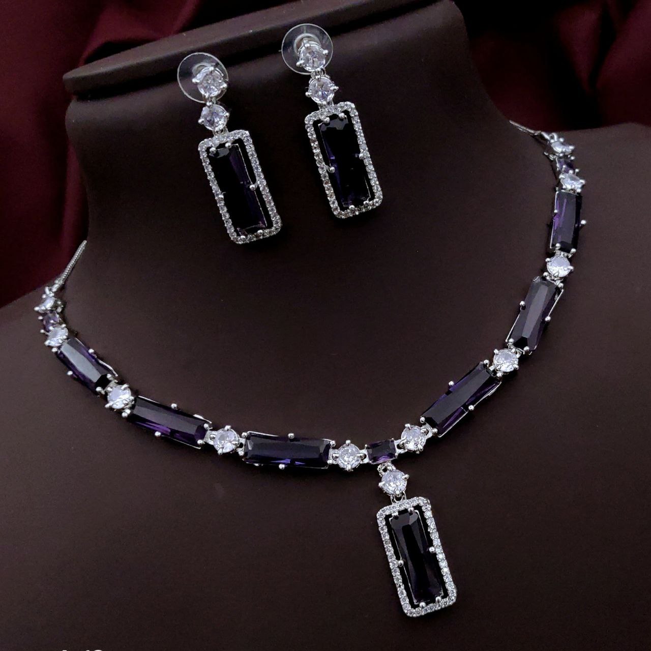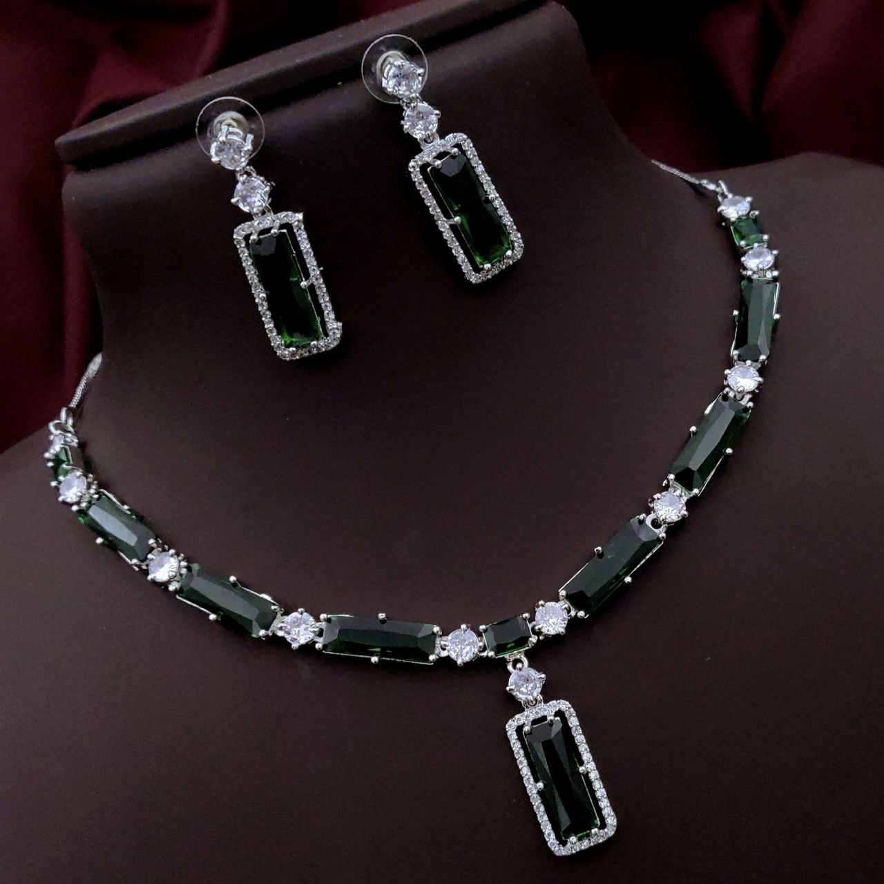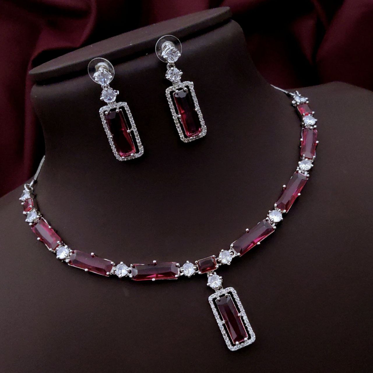 Grace your look with this stunning necklace set featuring elegant rectangular stones bordered with sparkling American Diamonds. This set includes a matching pair of earrings and is perfect for weddings, parties, and festive occasions. Designed with a modern touch and a timeless charm, it’s available in a variety of vibrant colors to match your personal style.