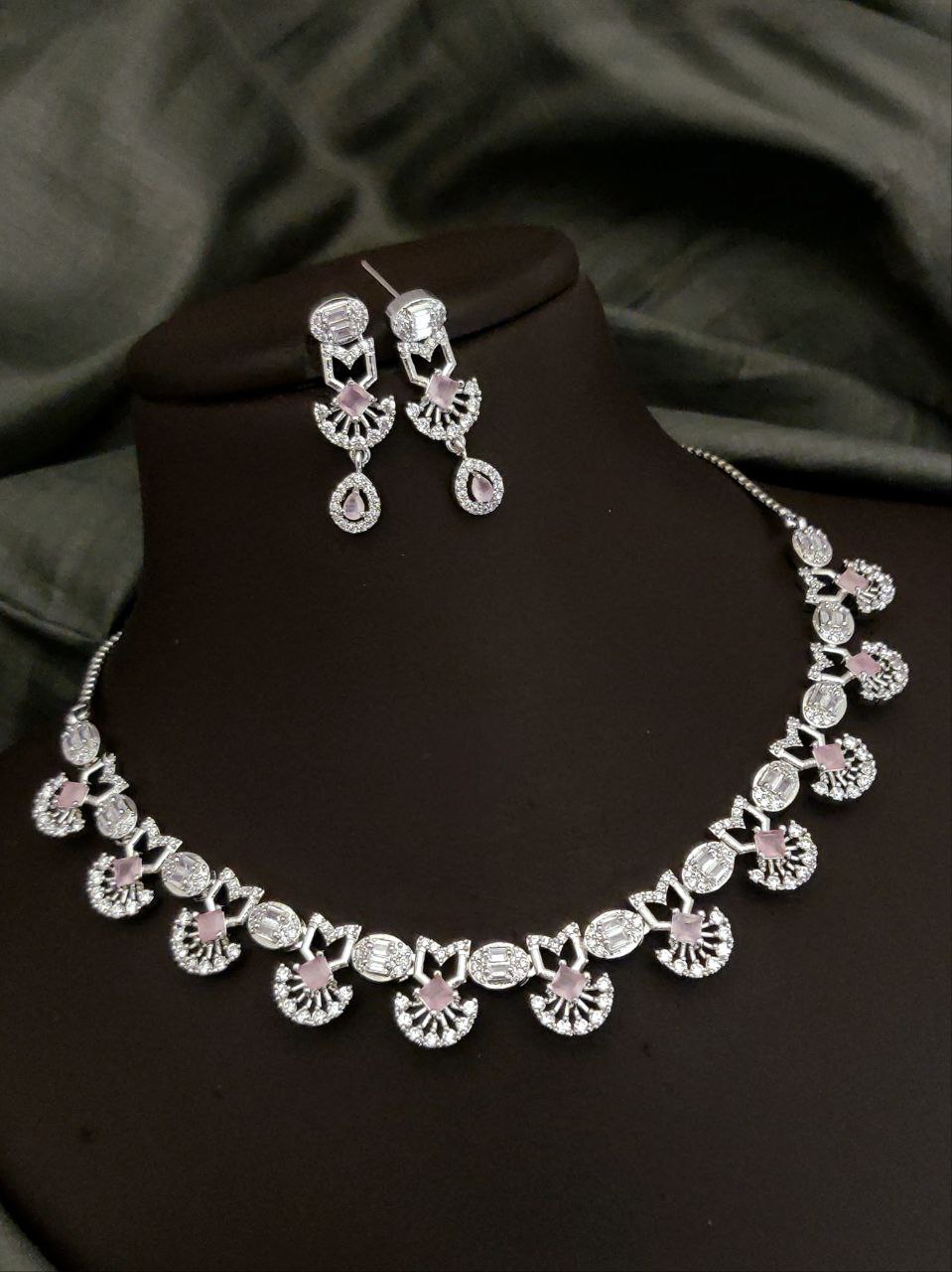 Turn every head with this show-stopping American Diamond necklace set that combines royal charm with contemporary design. Featuring a fan-inspired motif studded with shimmering AD stones and a hint of amethyst-toned accents, this piece is both bold and graceful. The baguette-cut stones and symmetrical artistry give it a luxe, high-fashion appeal. The coordinating earrings mirror the design beautifully, making it perfect for evening galas, festive occasions, and wedding celebrations.