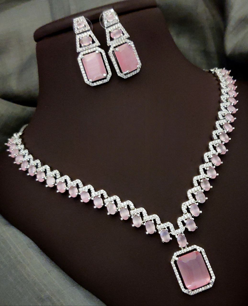 This designer necklace set brings together classic charm and contemporary sparkle. Crafted with precision, it showcases high-grade square-cut cubic zirconia stones in white, pink, mint green, deep navy blue, rich royal blue, green, red, pastel pink–green combinations. The necklace is beautifully complemented with matching earrings, all set in a stunning rhodium finish for a high-polish shine.