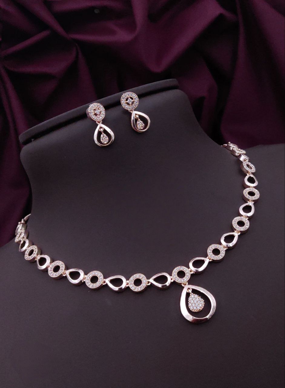 The rose gold necklace features alternating circle and teardrop motifs, each beautifully studded with sparkling AD stones. The matching earrings carry the same charm, making it a perfect set for: