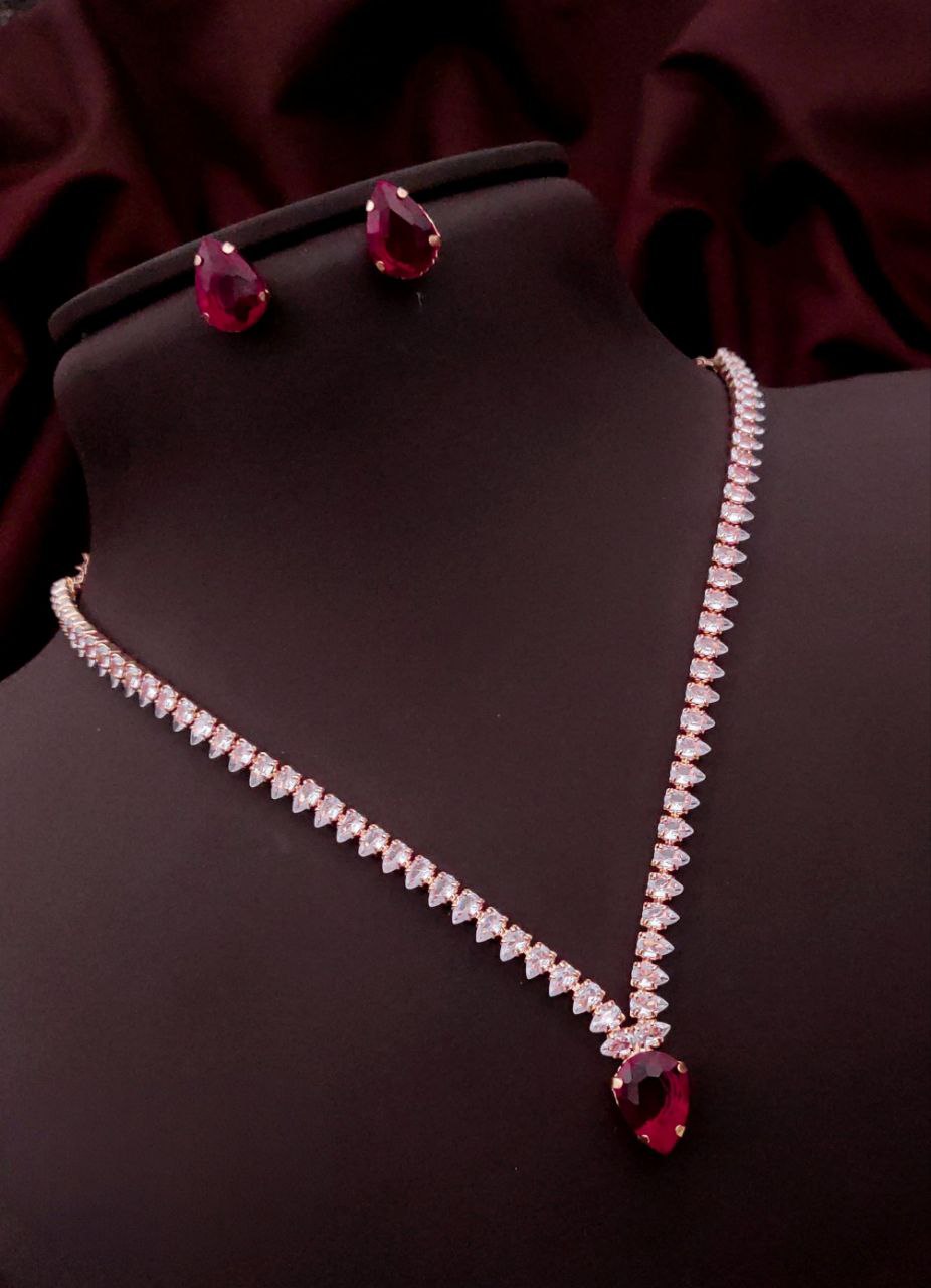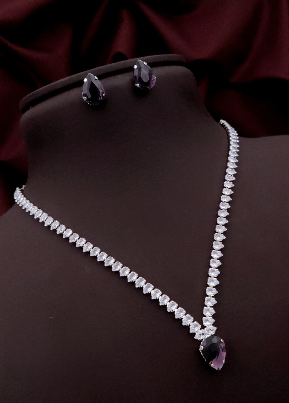 Stunning American Diamond necklace set with matching earrings. Features a teardrop gemstone centerpiece and is available in seven gorgeous colors. Ideal for festive wear, parties, and gifting.